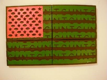 When I was getting ready to paint the Flag I toyed with the thought of painting it red, white, and blue. I ran the idea past my mom, who said that that would be too offensive to people. If someone walked into the gallery and saw cunt across the flag they would probably freak out. Then, I would have no chance of having them contemplate my piece. But, I hope they will see the green, black, and orange not as The American Flag, but as a type of American Flag. They will see my Flag as “the other’. Also, I hope they will be curious when they see the different colors and the strange way the stripes meander and sort of look like they might have letters in them.